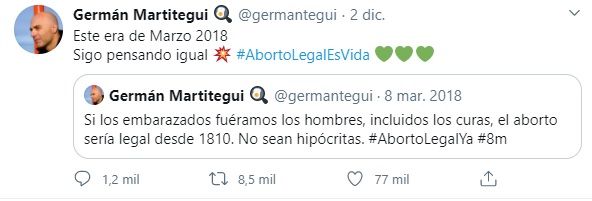Y hace unas horas, el cocinero volvió a reafirmar su pensamiento sobre este tema y lo reivindicó. "Este (tweet) era de marzo de 2018, sigo pensando igual. Aborto legal es vida".