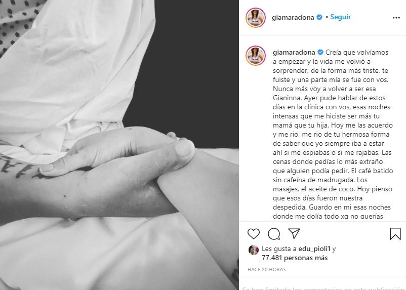 "Creía que volvíamos a empezar y la vida me volvió a sorprender, de la forma más triste, te fuiste y una parte mía se fue con vos. Nunca más voy a volver a ser esa Gianinna. Ayer pude hablar de estos días en la clínica con vos, esas noches intensas que me hiciste ser más tu mamá que tu hija. Hoy me las acuerdo y me rio, me rio de tu hermosa forma de saber que yo siempre iba a estar ahí si me espiabas o si me rajabas", indicó la madre de Benjamín.