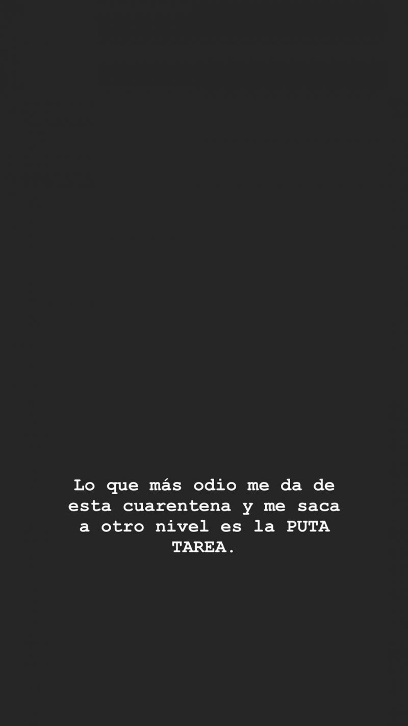 “Lo que más odio me da de esta cuarentena y me saca a otro nivel es la p… tarea”, lanzó sin filtro en sus historias de Instagram.