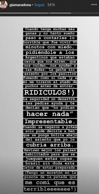 A través de unas publicaciones en su cuenta de Instagram, la hija de Diego Maradona detalló lo sucedido. "Fue horrible vivir 90 minutos con miedo, pidiéndole a los argentinos que estaban cerca que nos miren, que nos cuiden, que nos ayuden por las dudas. La gente sin asiento por los pasillos fumando como si nada (y a mí me tiraron el atado de puchos antes de entrar) ¡Ridículos!", indicó.