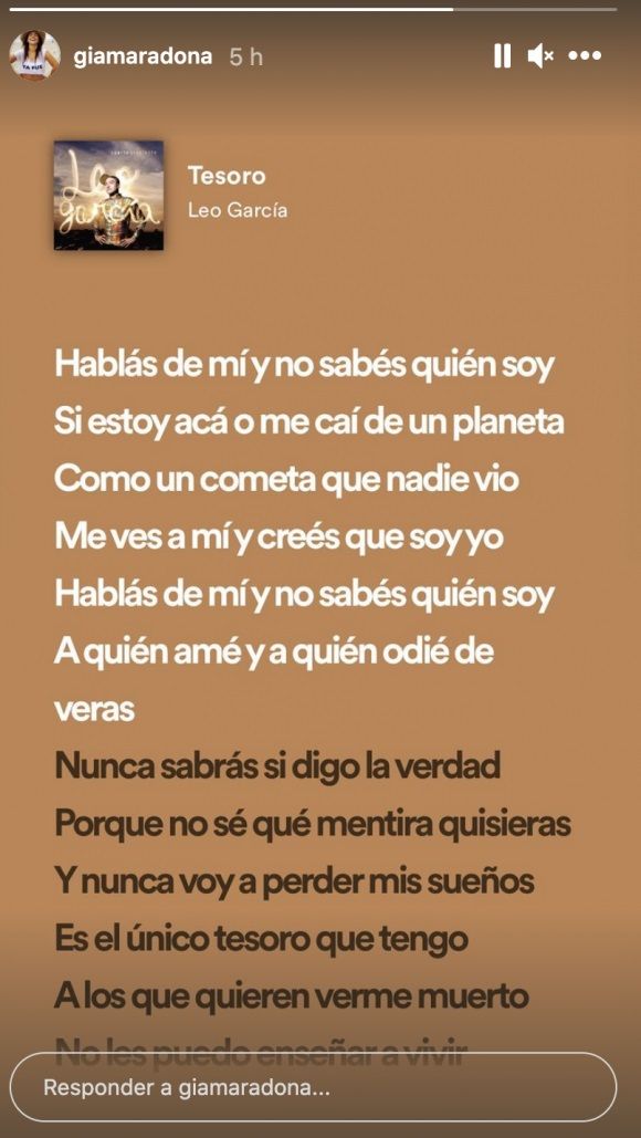Ahora, tras las llamativas afirmaciones de la mediática, Gianinna compartió la significativa letra de uno de los hits de Leo García, Tesoro. Y remarcó especialmente un párrafo que apunta contra las personas que opinan sobre las vidas ajenas sin saber demasiado.