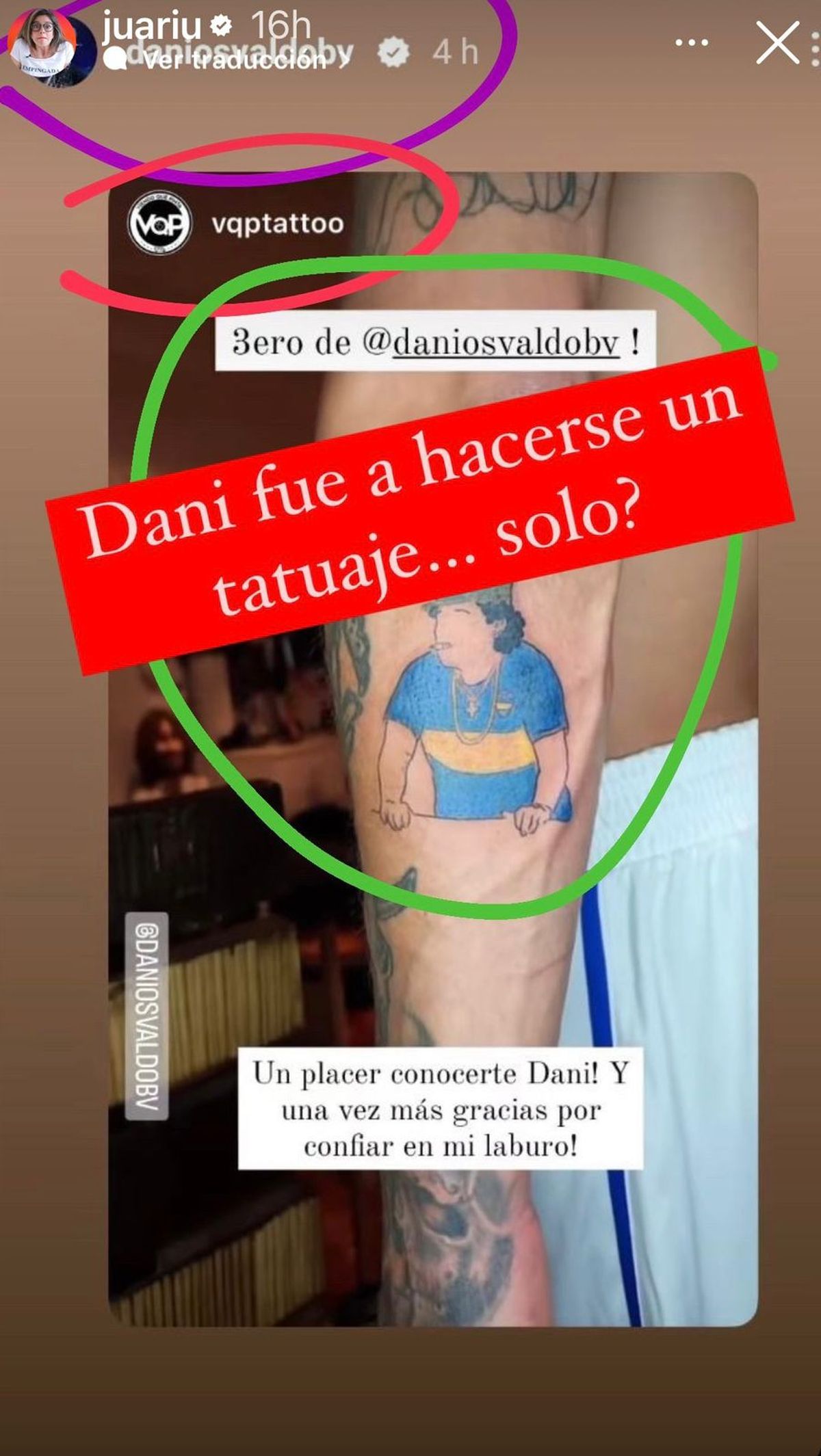 "Dani fue a hacerse un tatuaje... ¿solo?", escribió de forma picante la tucumana en sus stories, donde puede verse el tatto que se hizo del Diez con la camiseta de Boca. Así como también se imprimió un segundo tatuaje del astro caminando de la mano, nada menos que con Gianinna Maradona.