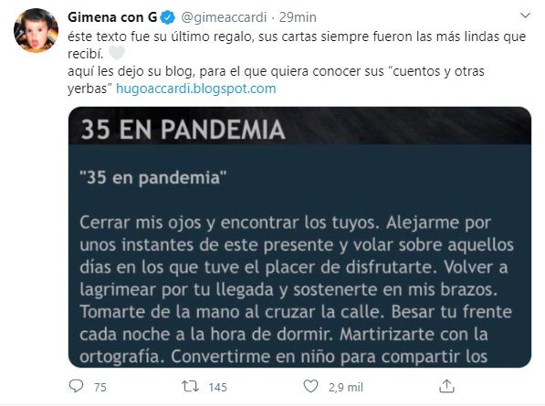 "Este texto fue su último regalo, sus cartas siempre fueron las más lindas que recibí. Aquí les dejo su blog, para el que quiera conocer sus “cuentos y otras yerbas http://hugoaccardi.blogspot.com", indicó con orgullo.