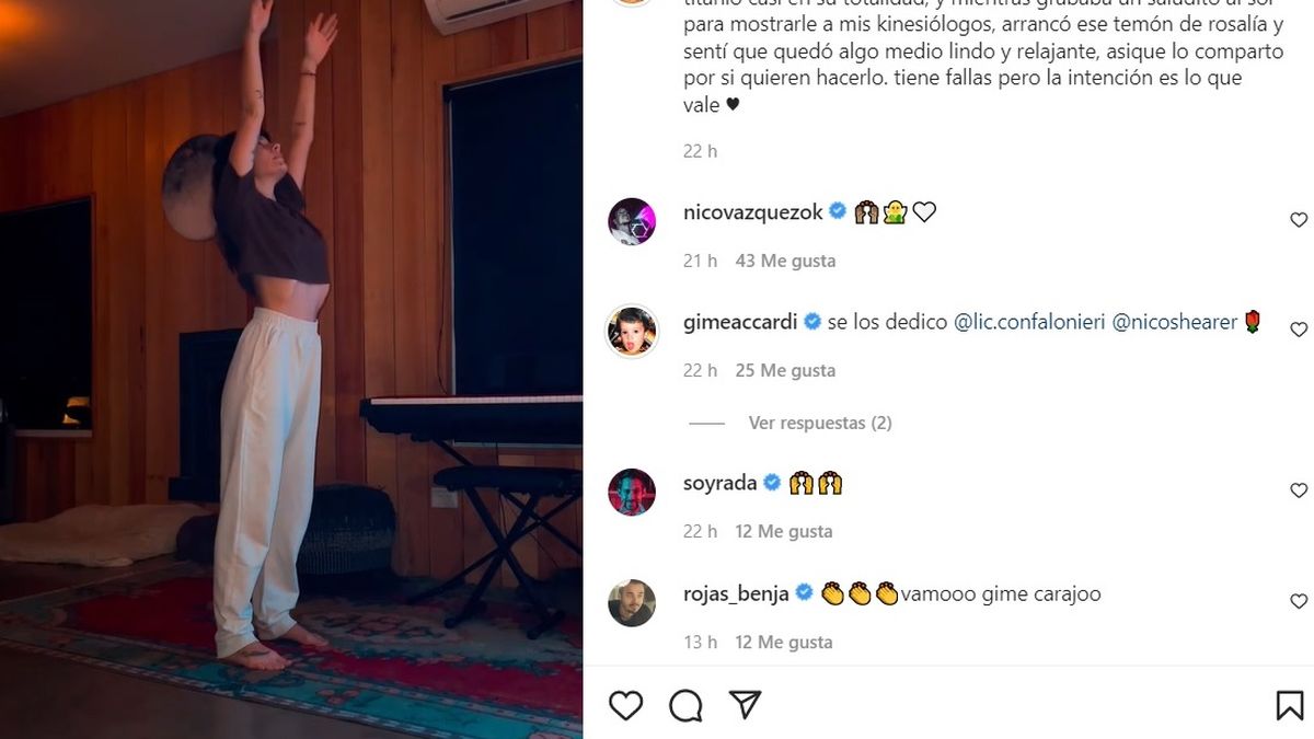 Su pareja Nicolás Vázquez comentó la publicación con distintos emojis de alegría y también se sumó su compañero de obra Benjamín Rojas: "Vamo Gime carajo".