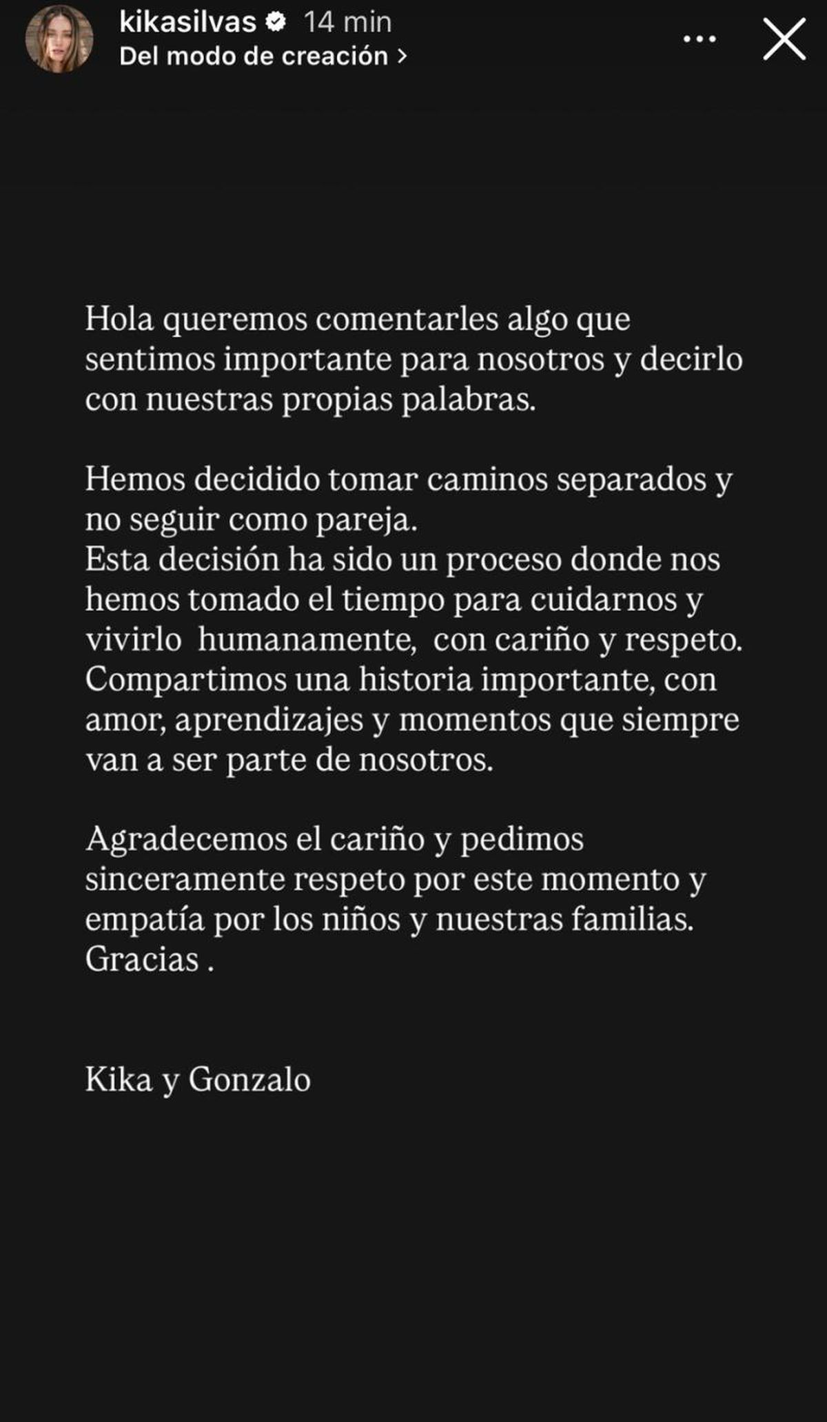 Gonzalo Valenzuela y Kika Silva decidieron ponerle punto final a su matrimonio, apenas un año después de haber pasado por el altar. La confirmación llegó a través de un comunicado conjunto que ambos compartieron en sus redes sociales, donde pidieron respeto y empatía en este momento personal.