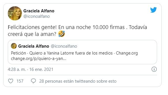 "Quiero a Yanina Latorre fuera de los medios. Se burla de pacientes con Parkinson, se burla del cáncer, invita a los jóvenes que se droguen, invita a nenas de 10 años a ver pornografía", indica la descripción de la petición que creó Noelia Carolina Díaz en la plataforma "Change.org".