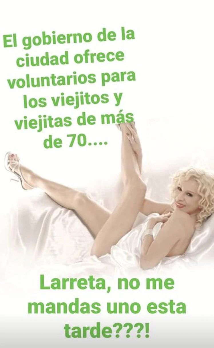 Por su parte, Nacha subió historias a Instagram sobre este tema: "Permiso para salir a los más de 70?????"; "El gobierno de la ciudad ofrece voluntarios para los viejitos y viejitas de más de 70... Larreta, no me mandas uno esta tarde", lanzó enojada.