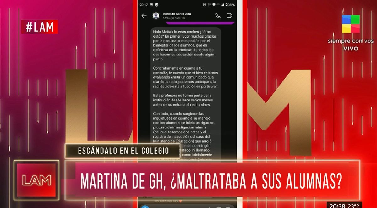 Luego de que el notero del ciclo que conduce Ángel de Brito, Alejandro Castelo, fuera prácticamente echado por la policía de la institución en la que trabaja Martina, se difundió un mensaje del Instituto, haciendo referencia a una de las participantes más polémicas del reality de Telefe, y alimentó el escándalo.