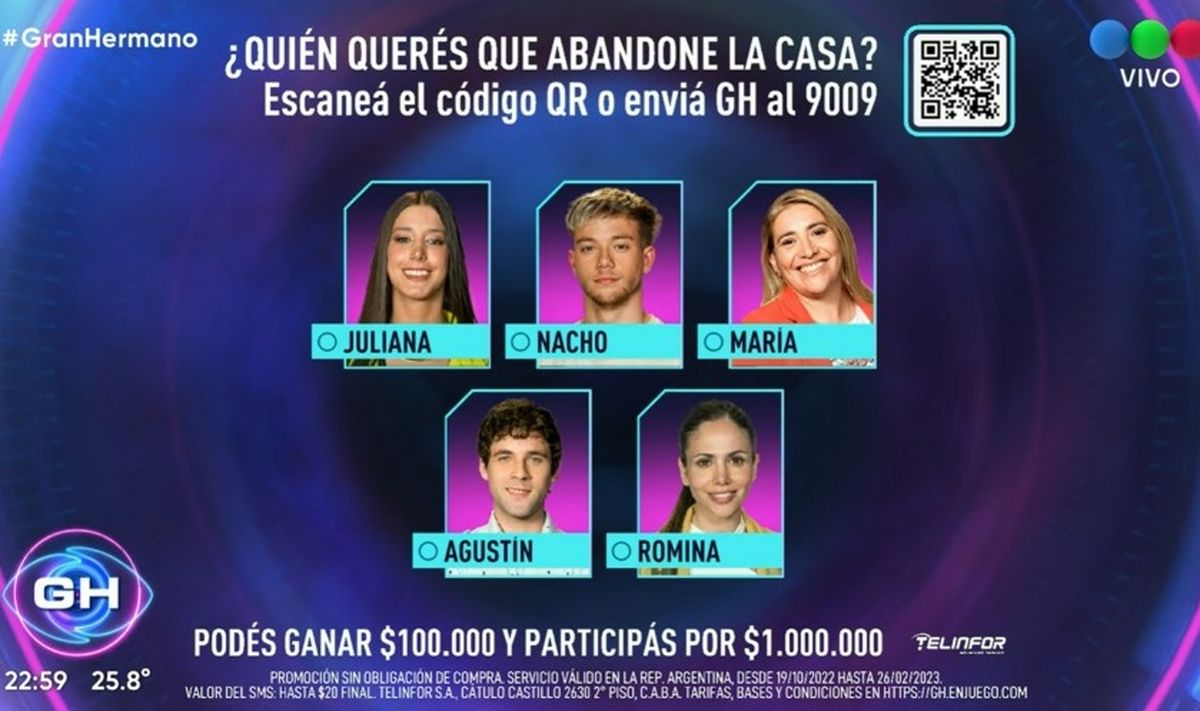 Así, se definió la placa de nominados: Juliana recibió nueve votos, Nacho ocho, María Laura siete, y Romina y Agustín cuatro cada uno, convirtiéndose en los cinco nominados de la noche.