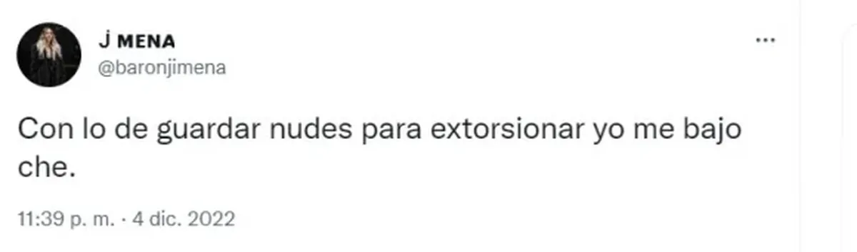 En su cuenta de Twitter, Jimena Barón expresó su indignación luego de enterarse de la actitud de Frodo: "Con lo de guardar nudes (desnudos) para extorsionar, yo me bajo, che".