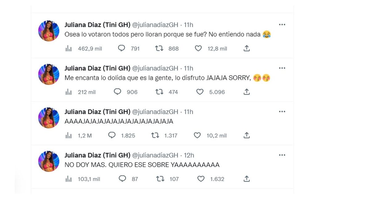 Y luego cuestionó: "¿O sea lo votaron todos pero lloran porque se fue? No entiendo nada". Los mensajes de Juliana tras la salida de Thiago de la casa generaron gran repercusión en la red social del pajarito.