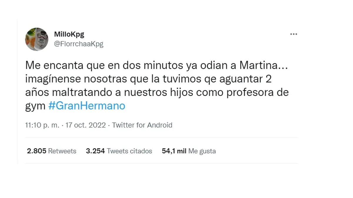 "Me encanta que en dos minutos ya odian a Martina... imagínense nosotras que la tuvimos que aguantar 2 años maltratando a nuestros hijos como profesora de gym #GranHermano", expresó un usuario.