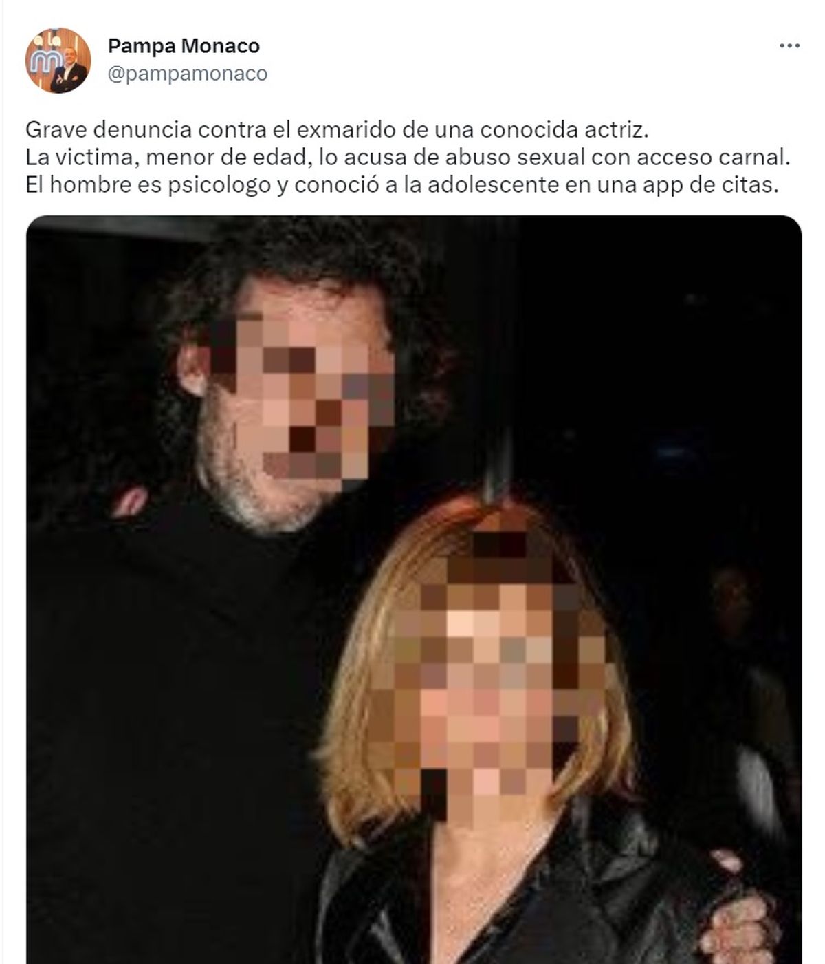 En tanto, el periodista especialista en policiales, Pampa Mónaco, amplió sobre la noticia: "Grave denuncia contra el exmarido de una conocida actriz. La victima, menor de edad, lo acusa de abuso sexual con acceso carnal. El hombre es psicólogo y conoció a la adolescente en una app de citas".