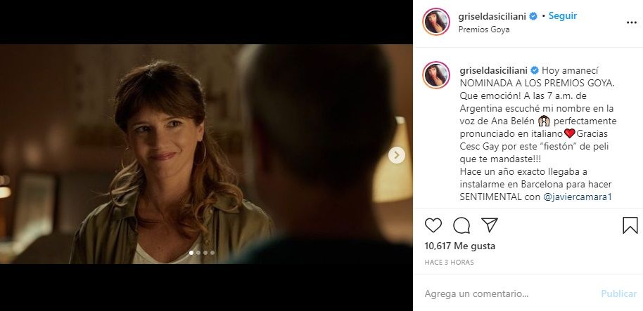 "Hoy amanecí NOMINADA A LOS PREMIOS GOYA. Que emoción! A las 7 a.m. de Argentina escuché mi nombre en la voz de Ana Belén perfectamente pronunciado en italiano. Gracias Cesc Gay por este “fiestón” de peli que te mandaste!!! Hace un año exacto llegaba a instalarme en Barcelona para hacer SENTIMENTAL con @javiercamara1 @belen_cue y #AlbertoSanJuan Y ya trabajar con ellos me parecía un premio, los amo amigos queridos...", indicó feliz la actriz en Instagram.