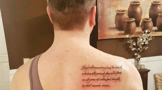 PrimiciasYa.com se contactó en exclusiva con el mediático quien explicó el por qué de su nuevo tattoo: "Es una frase de un autor inglés William Workworf de fines del Siglo XIX y está en inglés. En castellano, traducida, dice algo así: 'Aunque nada pueda regresar la hora del esplendor en la hierba, de la gloria en una flor, no estemos mal, más bien tratemos de ser felices con lo que nos queda porque la belleza y la juventud permanecerán intactas en el recuerdo'".