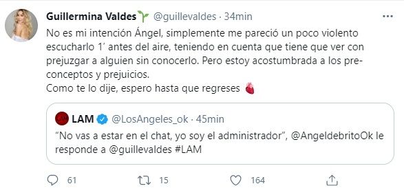 "No es mi intención Ángel, simplemente me pareció un poco violento escucharlo 1’ antes del aire, teniendo en cuenta que tiene que ver con prejuzgar a alguien sin conocerlo. Pero estoy acostumbrada a los pre-conceptos y prejuicios. Como te lo dije, espero hasta que regreses", comentó Valdés a un mensaje de De Brito en la red social.