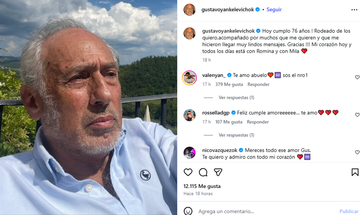 A la publicación reaccionaron con grandes deseos y mensajes llenos de amor, entre ellos, Valentín, su nieto: "Te amo abuelo. Sos el número 1", escribió Valentín. "Feliz cumple abueliten. Te amo con todo el corazón", agregó Franco, miembro del elenco de Margarita. Rossella Della Giovampaola, su pareja, también se sumó a la catarate de mensjes: "Feliz cumple amore. Te amo".
