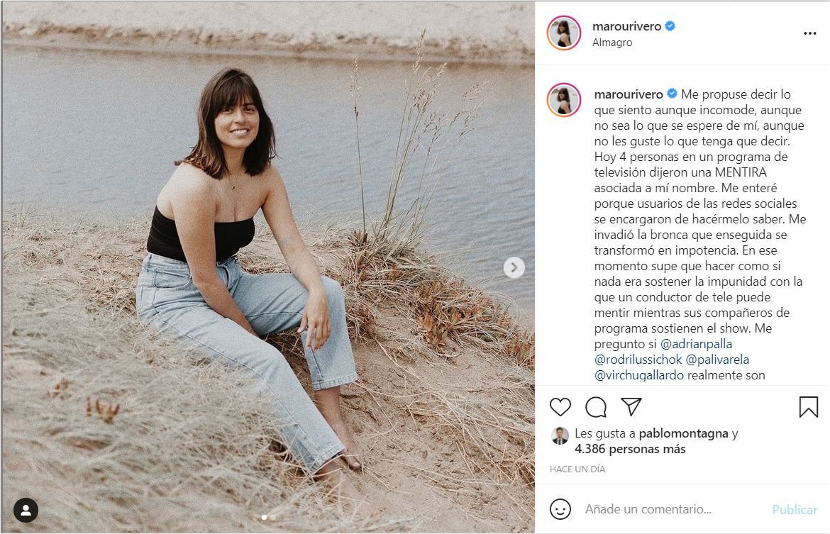 "Me propuse decir lo que siento aunque incomode, aunque no sea lo que se espere de mí, aunque no les guste lo que tenga que decir. Hoy 4 personas en un programa de televisión dijeron una MENTIRA asociada a mí nombre. Me enteré porque usuarios de las redes sociales se encargaron de hacérmelo saber. Me invadió la bronca que enseguida se transformó en impotencia. En ese momento supe que hacer como si nada era sostener la impunidad con la que un conductor de tele puede mentir mientras sus compañeros de programa sostienen el show. Me pregunto si @adrianpalla @rodrilussichok @palivarela @virchugallardo realmente son concientes de la violencia que generan con sus frases hechas chiste? O si @palivarela @virchugallardo @adrianpalla @rodrilussichok realmente quieren que sus familias, hijos, amigos vivan en una sociedad que miente y desvaloriza al otro por deporte? Será que @rodrilussichok @virchugallardo @adrianpalla @palivarela son conscientes del impacto que tiene su FALSA noticia en mí salud mental? Me encantaría que así como se tomaron 7 minutos para difamarme se lo tomen también para responderme. Aquí y ahora dejo de sostener las prácticas violentas que en otro momento hubiese minimizado. No quiero que por tener miedo a que esto escale (y mi hermoso ecosistema digital se llene de haters) 4 personas sientan que puede decir lo que quieren sin consecuencias. Hace un año en #conchapodcast me juré a mí misma que iba a dejar de sostener el patriarcado y de esto se trata este post. Me gusta mí nueva versión, me costo un montón de trabajo personal llegar hasta acá y el mundo que yo trato de construir es uno que no lastima a los otros", escribió la joven.