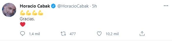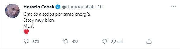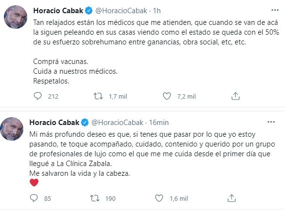Este viernes, Cabak volvió a volcarse a las redes sociales para destacar la labor de los médicos que lo atendieron tras las declaraciones del presidente de Alberto Fernández donde sostuvo que "el sistema de salud también se ha relajado".