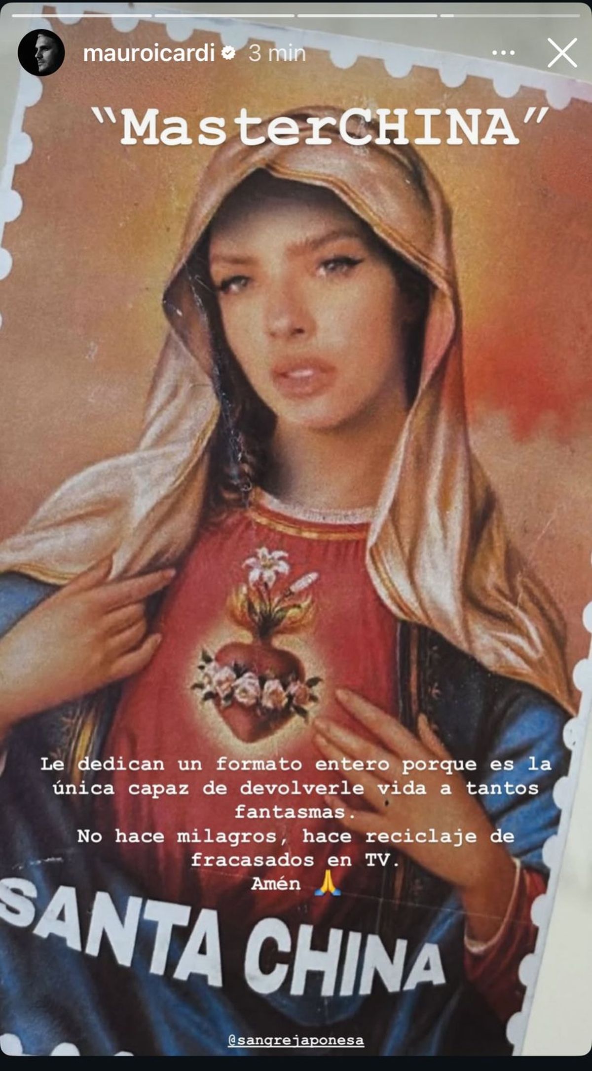 En sus historias de Instagram compartió una imagen de su pareja, donde se la veía en una estampita religiosa. “MasterChina. Le dedican un programa entero porque es la única capaz de devolverle vida a tantos fantasmas”, escribió Icardi con ironía.