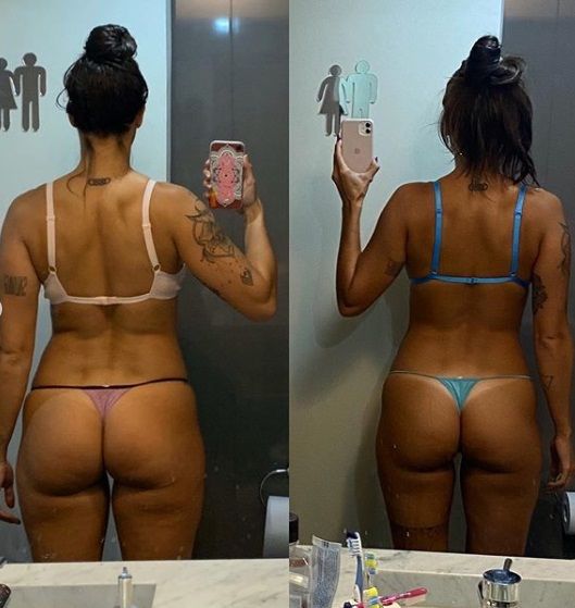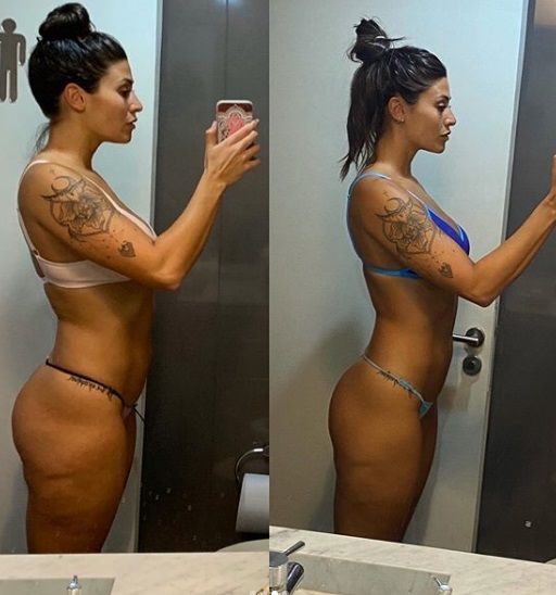 "10/09/19 - 05/01/20. 1.73 28 años 66kg - 1.73 29 años 65kg. Bastante % graso - Poco % graso. Masa musc normal - masa musc ALTA. No se si es más linda o mejor la primer o la segunda imagen, pero en las dos me siento de formas muy distintas. En la primer imagen hay una ivana descuidada, entregada a comer mal el 70% del tiempo, cuidándose muy poco y entrenando 3/4 veces por semana, sin darlo al 100%", comenzó su posteo Ivana, contando el proceso de su cambio.
