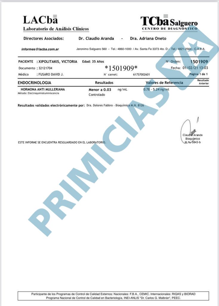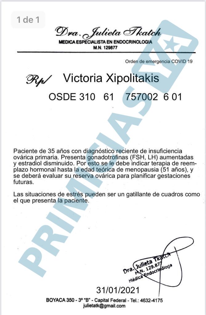 Este medio también tuvo acceso a los documentos médicos que presentó Victoria ante el Juez. Cabe destacar que la carta fue copiada tal cual el documento original que Xipolitakis hizo llegar a la Justicia.