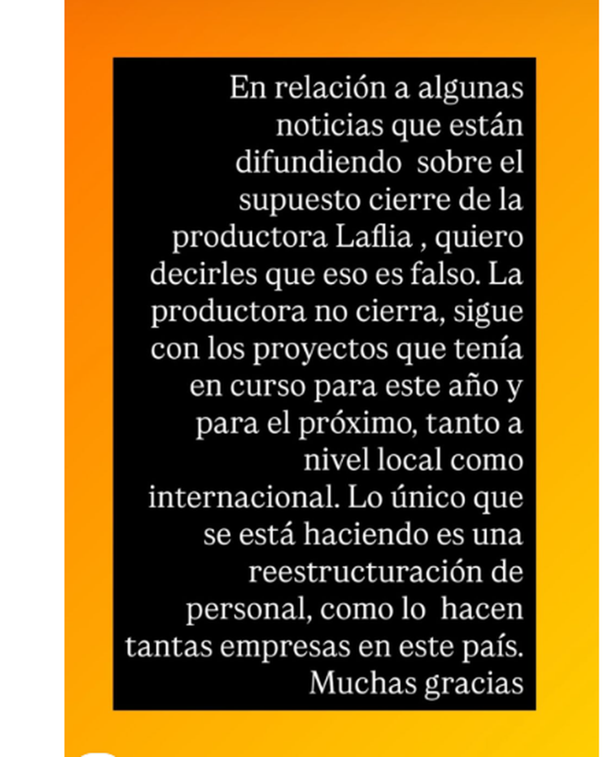 A través de una historia de Instagram, el conductor desmintió categóricamente los rumores y confirmó que la firma sigue operativa. “En relación a algunas noticias que están difundiendo sobre el supuesto cierre de la productora LaFlia, quiero decirles que eso es falso”, publicó.