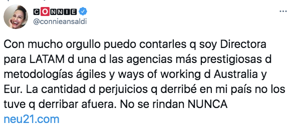 “Con mucho orgullo puedo contarles que soy directora para LATAM (Latinoamérica) de una de las agencias más prestigiosas de metodologías ágiles y ways of working de Australia y Europa. La cantidad de prejuicios que derribé en mi país no los tuve que derribar afuera. No se rindan nunca. Neu21.com", fue el posteo que utilizó Connie Ansaldi para contarle al mundo que inicia una nueva etapa en su vida profesional.