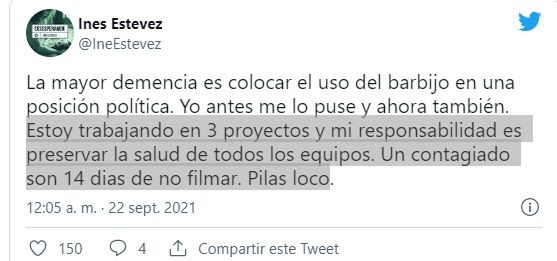 “Yo no me saco el barbijo ni en pedo y me sigo cuidando. Lavado de manos. Alcohol 70/30. Metro y medio de distancia y todo eso”, señaló la actriz desde Twitter.