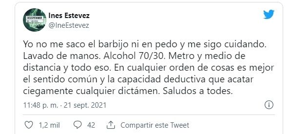 Y agregó con fuerza: “En cualquier orden de cosas es mejor el sentido común y la capacidad deductiva que acatar ciegamente cualquier dictamen. Saludos a todes”.