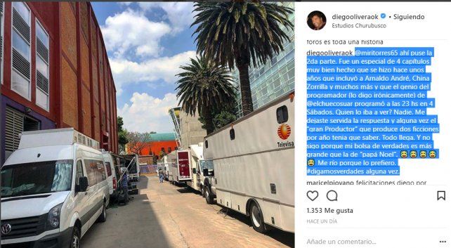 "Estos "Foros" ("Estudios" en Argentina) encierran gran parte, por no decir toda la historia de la época de oro del Cine Mexicano. En esas épocas, en Argentina eran los estudios Baires, y es para mí un placer regresar (aquí grabe la telenovela "Vivir Sin Ti" para TvAzteca y Argos) aunque sea por un rato... tener el inmenso honor de pisar los mismos lugares que pisaron Pedro Infante, Alain Delon, John Wayne, Sarita Montiel, Pedro Armendáriz entre tantos otros. Sucedió algo parecido con los estudios Baires cuando grabé la 2da Parte de "Piel Naranja" y grandes actores argentinos y extranjeros pisaron aquellos Estudios. Yo les comparto esta sensación que me llena de orgullo y gratitud... y créanme que mas que cualquier Premio anual, este es un Premio Permanente y para toda la vida", fue el texto que usó Diego Olivera para describir su sentimiento en el set de filmación.