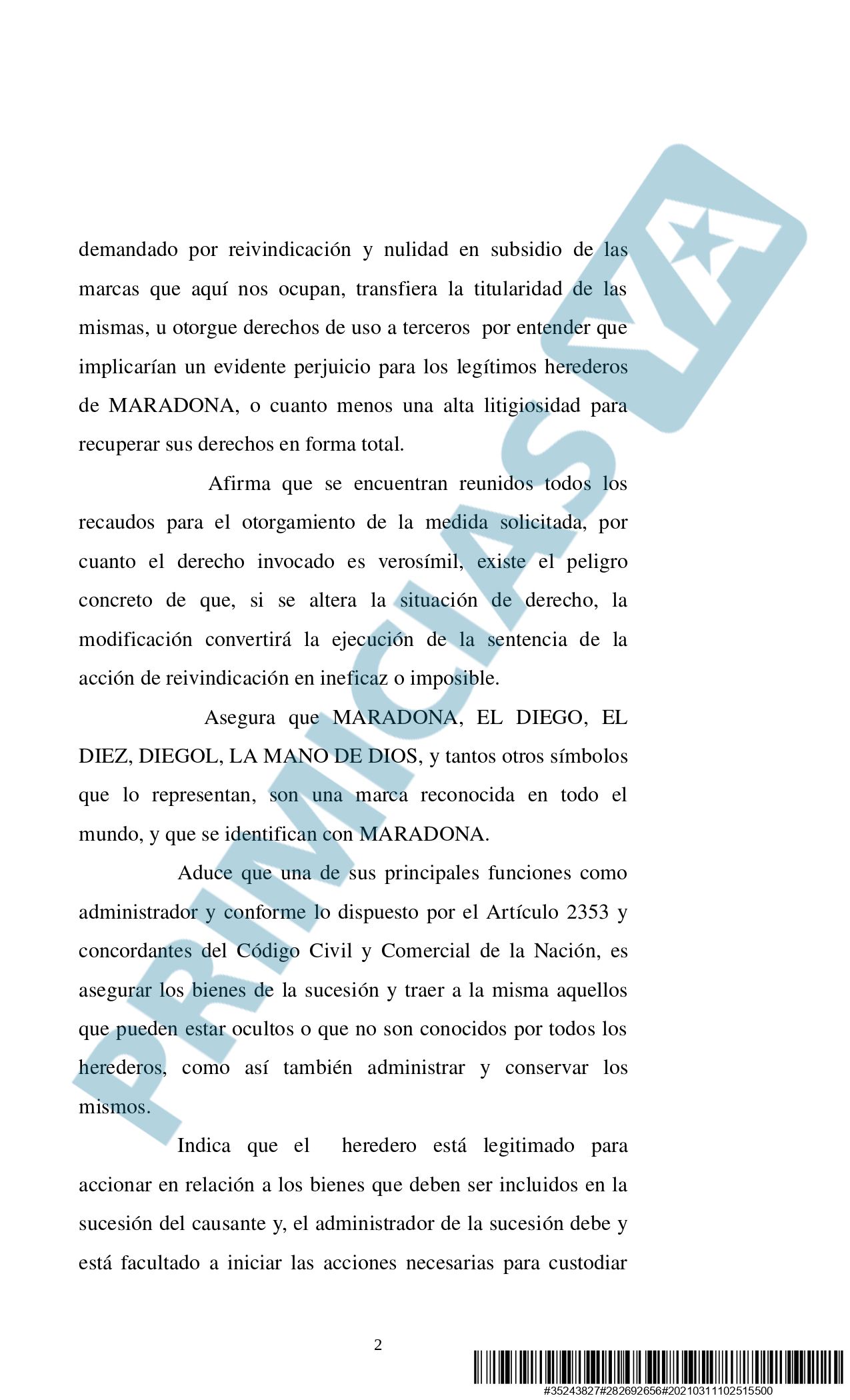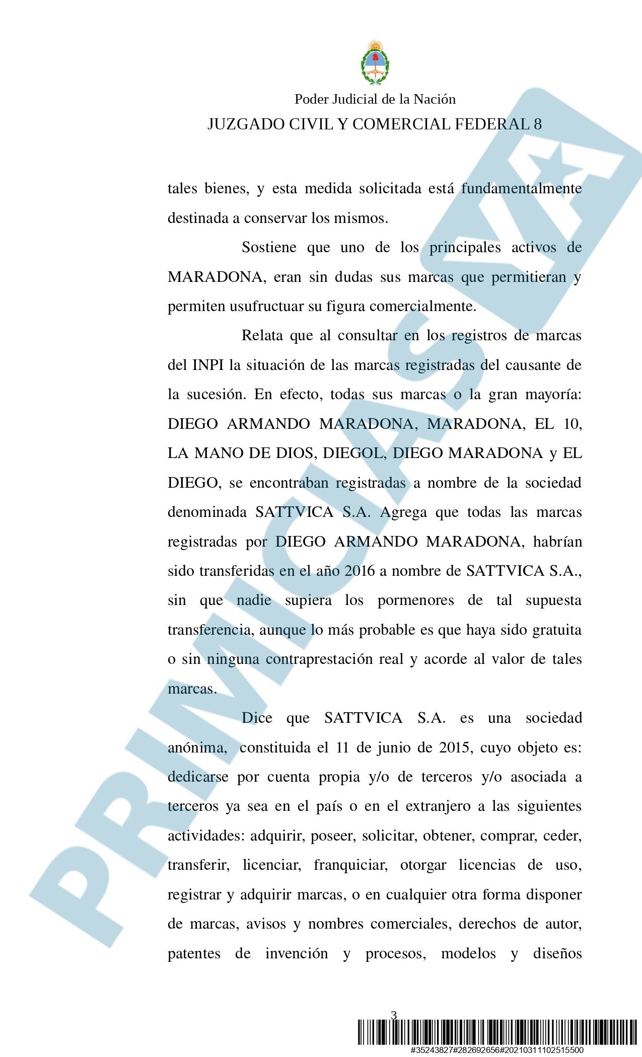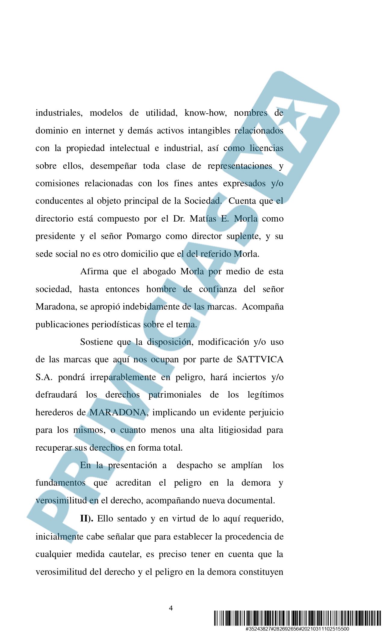 En exclusivo te mostramos la presentación que realizó el representante legal de Dieguito Fernando contra la sociedad Sattvicca SA cuyo titulares son Matías Morla y Maximiliano Pomargo que les impediría de poder utilizar las marcas que tienen registradas como propiedad intelectual para promocionar cualquier producto con el nombre Maradona en el marco legal de la sucesión.