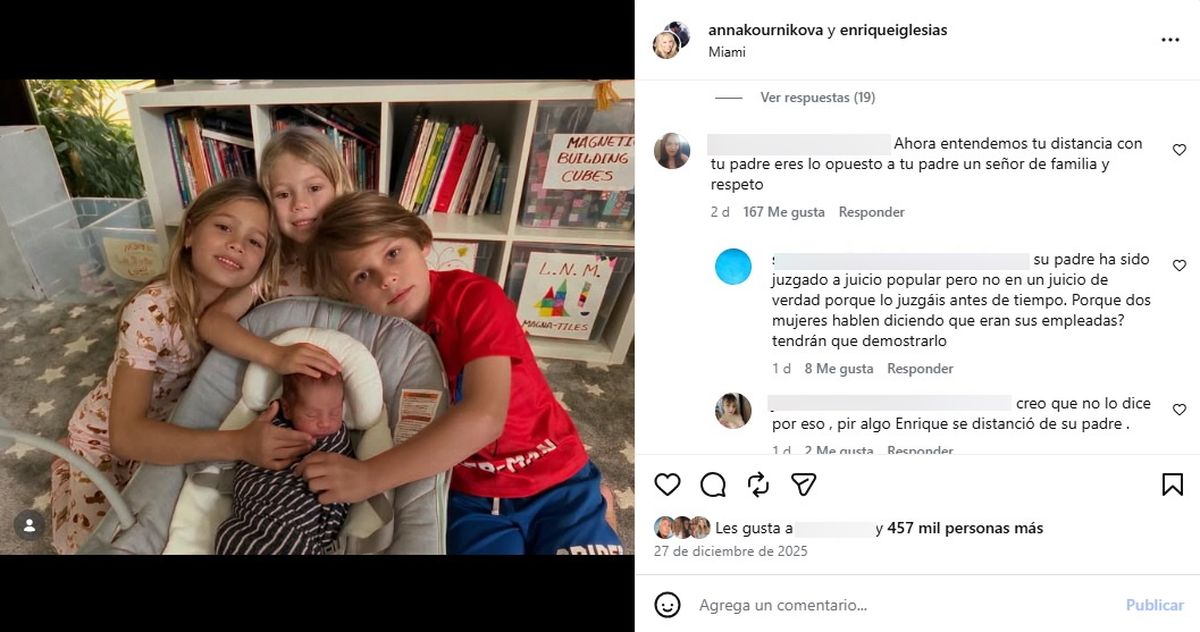 Allí, con una postal de sus cuatro hijos donde los tres mayores le dan la bienvenida al flamante integrante de la familia, una usuaria comentó en las últimas horas: "Ahora entendemos tu distancia con tu padre eres lo opuesto a tu padre un señor de familia y respeto", desatando un picante debate entre las seguidoras de la pareja de Anna Kournikova.