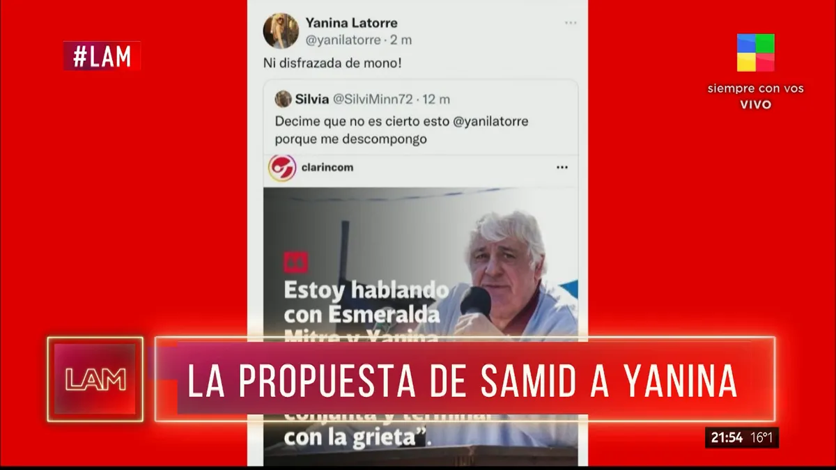 Hace unas semanas, en medio de sus vacaciones, Yanina Latorre se comunicó con LAM (América TV) para referirse a una información que dio Alberto Samid. El empresario de la carne afirmó que estaba en conversaciones con la angelita para armar una fórmula para las próximas elecciones. "Estoy hablando con Esmeralda Mitre y Yanina Latorre para hacer una fórmula conjunta y terminar con la grieta", sostuvo.