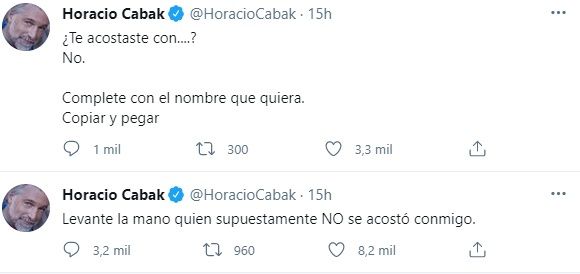 "¿Te acostaste con....? No. Complete con el nombre que quiera. Copiar y pegar", expresó el animador, bien irónico. Y antes había tuiteado: "Levante la mano quien supuestamente NO se acostó conmigo".