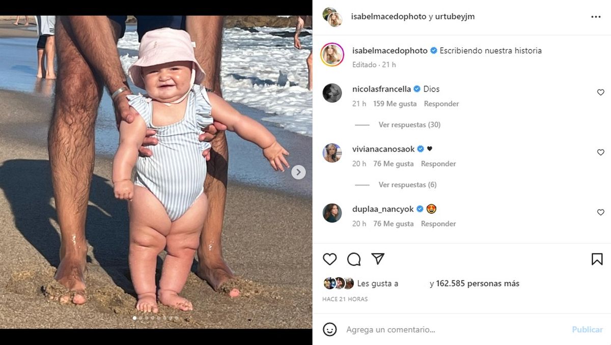 "Yo Te amo. Para mí, sos perfecta. Hagamos esto: Vamos a dejar pasar los comentarios negativos. Vamos a hacer de cuenta que no los leímos. Vamos a creer en un mundo MEJOR, lleno de gente buena, ¿dale?" fueron las primeras líneas de un nuevo posteo de Isabel Macedo donde tiene a upa a Julia de espaldas al mar.