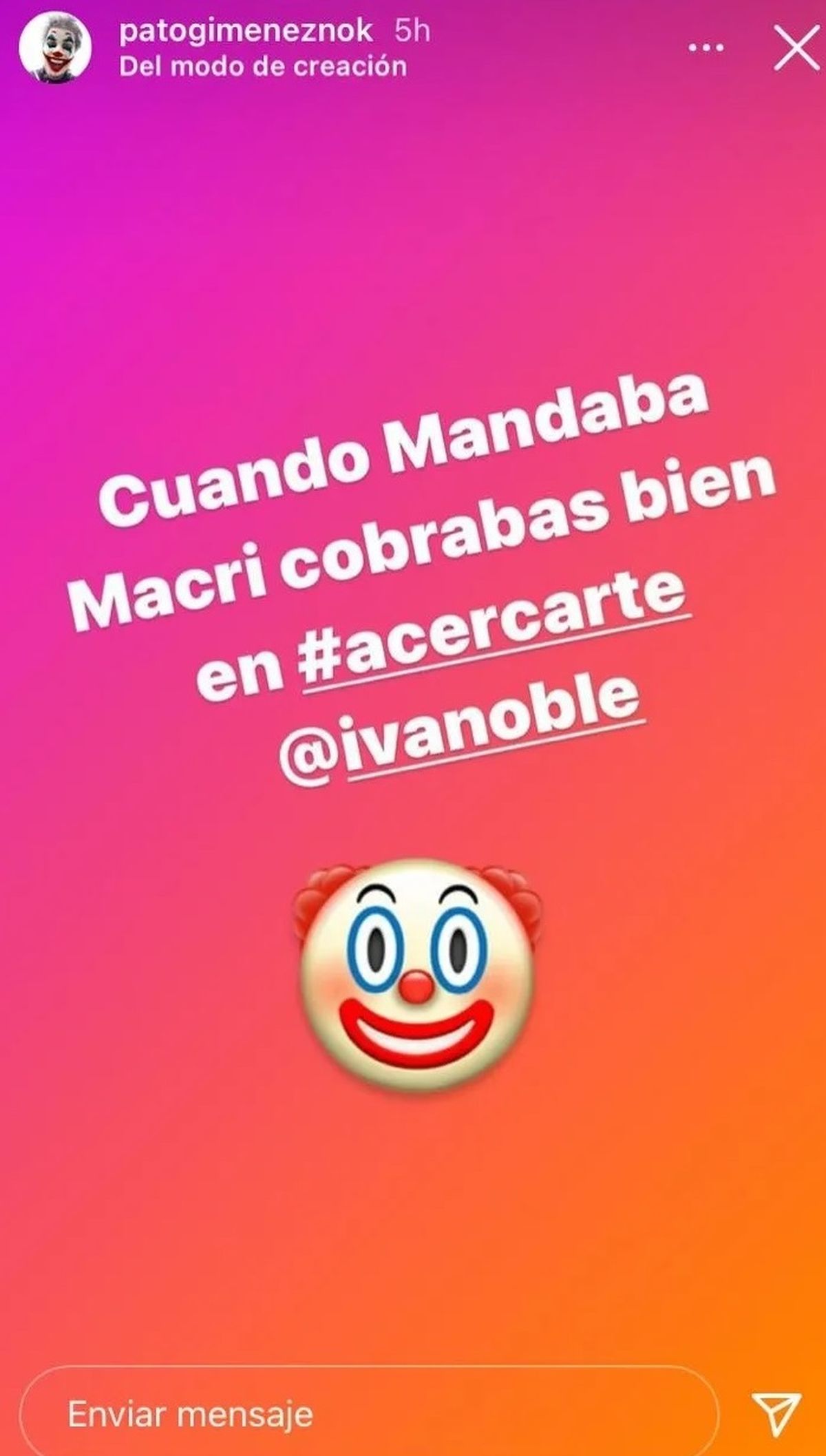 "Cuando mandaba Macri cobrabas bien en Acercarte", precisó vía Instagram stories, arrobando directamente a Noble. Grieta a pleno.