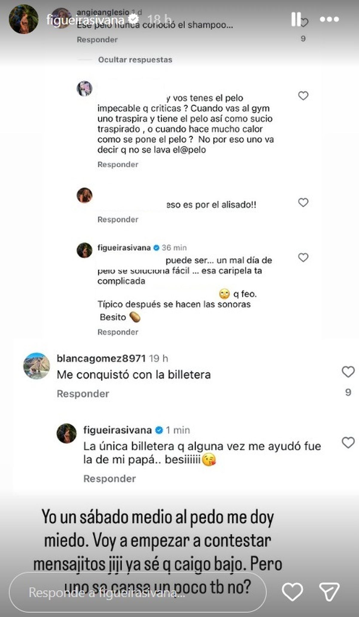 Al mostrar esos mensajes como ejemplo del hate, Ivana reflexionó ya harta de ese odio virtual: "Yo un sábado medio al pedo me doy miedo. Voy a empezar a contestar mensajitos jiji ya sé que caigo bajo. Pero uno se cansa un poco también, ¿no?”.