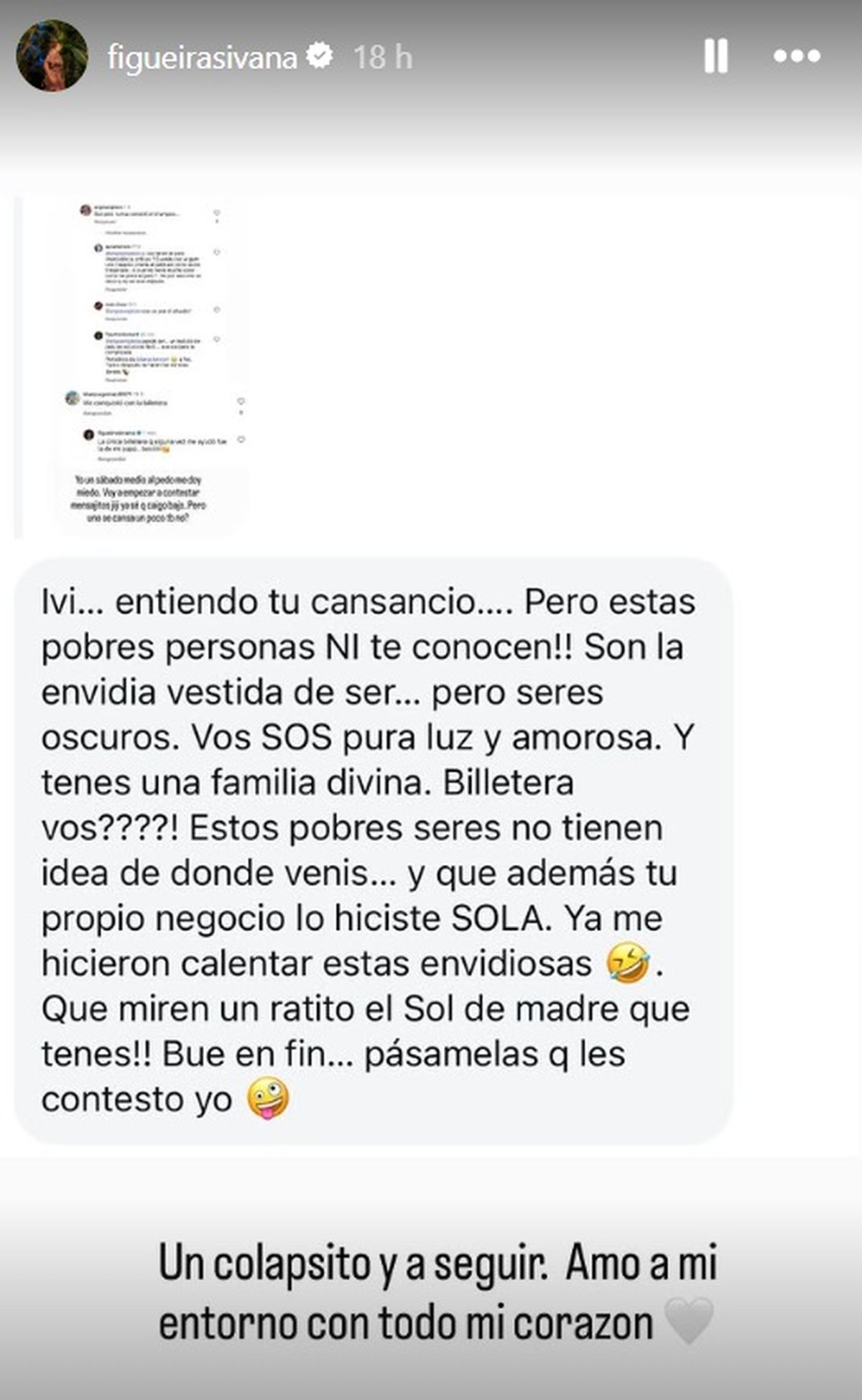 "Estas pobres personas no te conocen, son la envidia vestida de ser. Vos sos pura luz y amorosa y tenes una familia divina. ¿Billetera vos? Estos pobres seres no tienen idea de dónde venis y que además tu propio negocio lo hiciste sola", fue el mensaje que recibió Ivana a puro afecto ante las críticas recibidas.