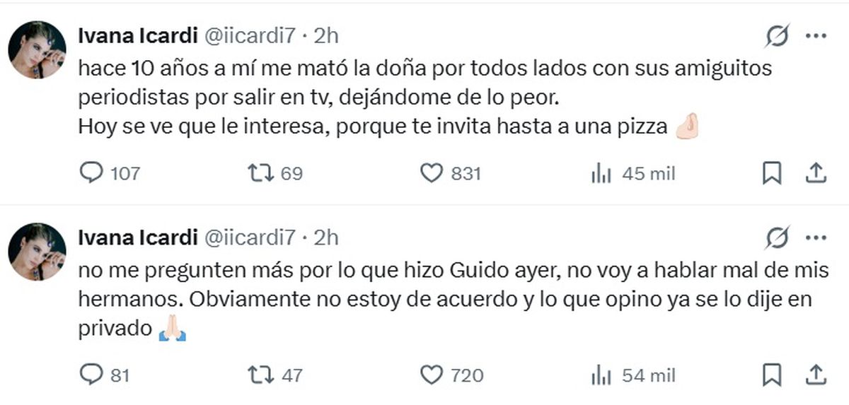 A través de su cuenta en X, Ivana Icardi fue contundente tras ver a su hermano Guido en un programa de televisión: "No me pregunten más por lo que hizo Guido ayer, no voy a hablar mal de mis hermanos. Obviamente no estoy de acuerdo y lo que opino ya se lo dije en privado", marcó su postura.