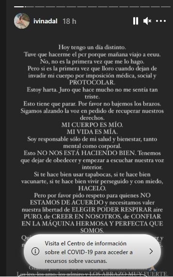 "Esto tiene que parar. Por favor, no bajemos los brazos. Sigamos alzando la voz en pedido de recuperar nuestros derechos. Mi cuerpo es mío, mi vida es mía. Soy responsable sólo de mi salud y bienestar, tanto mental como corporal. Esto no nos está haciendo bien. Tenemos que dejar de obedecer y empezar a escuchar nuestra voz interior", fundamentó la influencer.