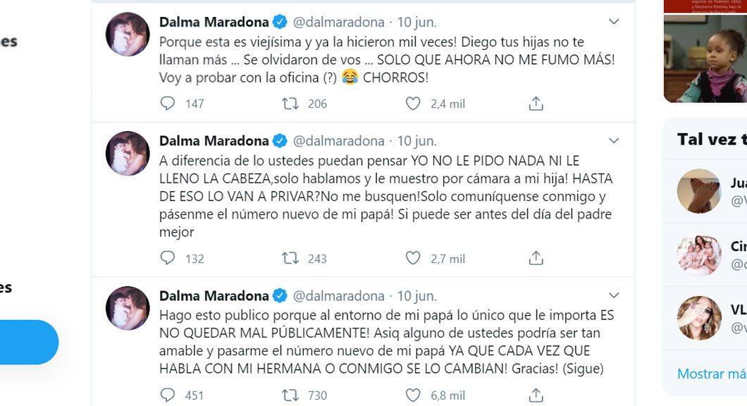 Además, apuntó contra Dalma por sus posteos en Twitter: “Me parece recontra ridículo poner en redes que no me puedo comunicar incluso con mi mamá. Yo si no me puedo comunicar con la persona, pregunto, me comunico con gente que tenga cercana, pero no lo estoy poniendo en las redes. Capaz algún día les funcione, pero por ahora ¿funcionó?”.