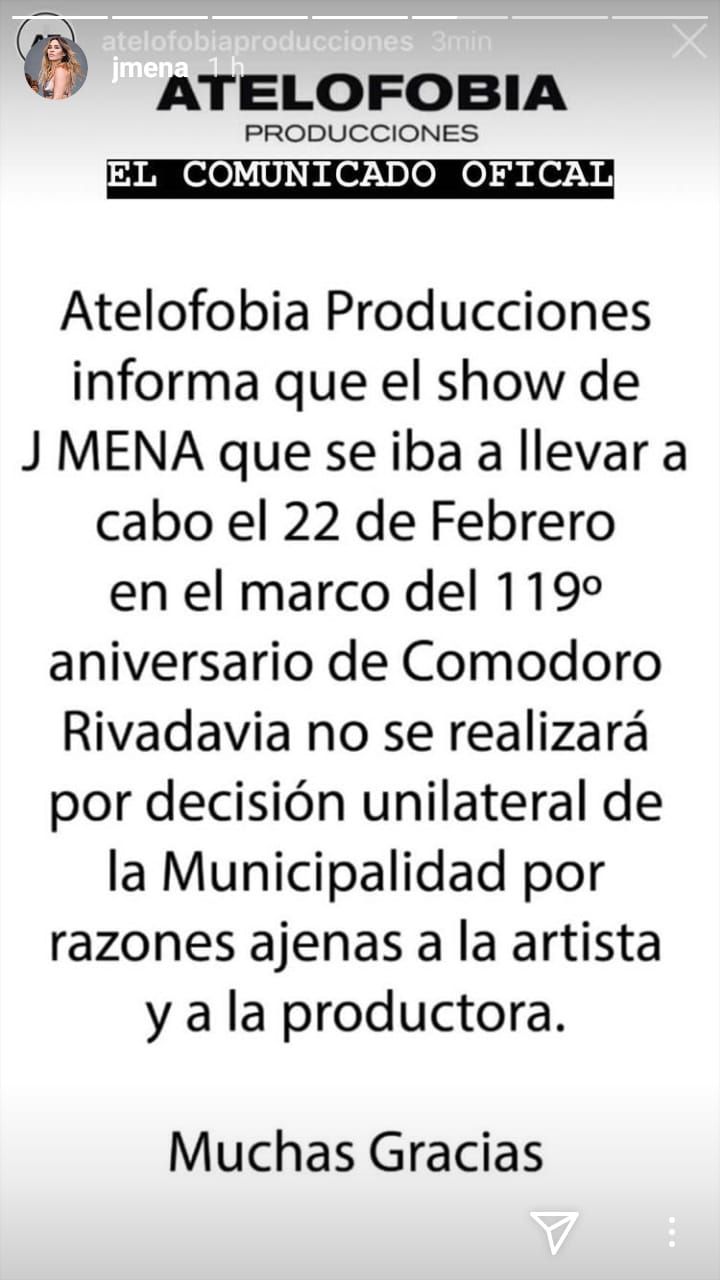 Sorpresivamente, el municipio de esa ciudad decidió reprogramar su presentación y por eso la cantante decidió denunciar lo ocurrido a través de sus stories en Instagram.