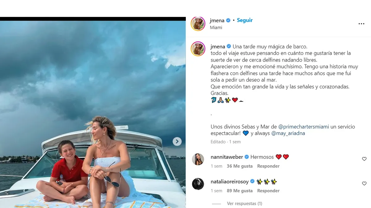 "Una tarde muy mágica de barco. Todo el viaje estuve pensando en cuánto me gustaría tener la suerte de ver de cerca delfines nadando libres", indicó movilizada Jimena Barón.