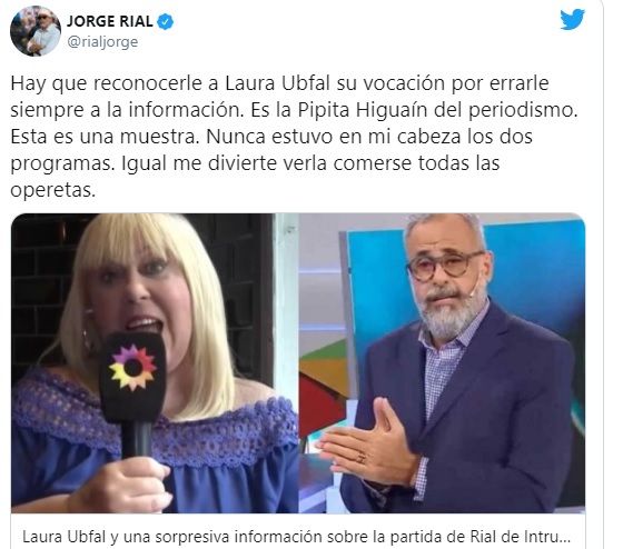 Al enterarse de los dichos de Ubfal, Rial recogió el guante y apuntó contra su colega en Twitter: “Hay que reconocerle a Laura Ubfal su vocación por errarle siempre a la información. Es la Pipita Higuaín del periodismo. Esta es una muestra. Nunca estuvo en mi cabeza los dos programas. Igual me divierte verla comerse todas las operetas”.