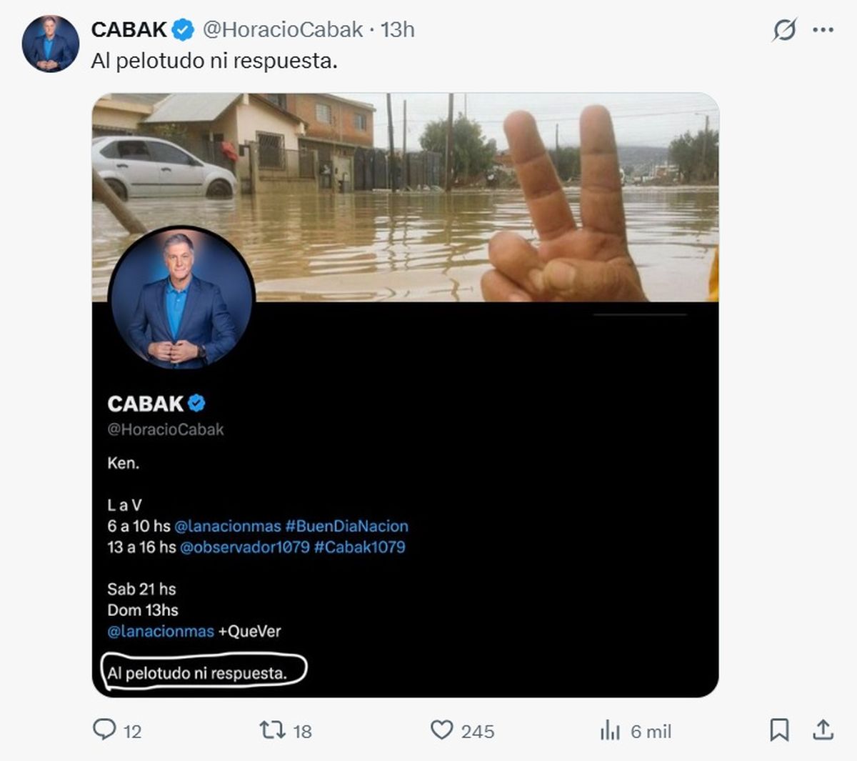 "Al pelotu... ni respuesta", comentó el conductor de La Nación+ junto a una imagen de un barrio inundado y una mano con dos dedos levantados en forma de v que simboliza al peronismo contestando además a todos los que lo cuestionan desde la virtualidad.
