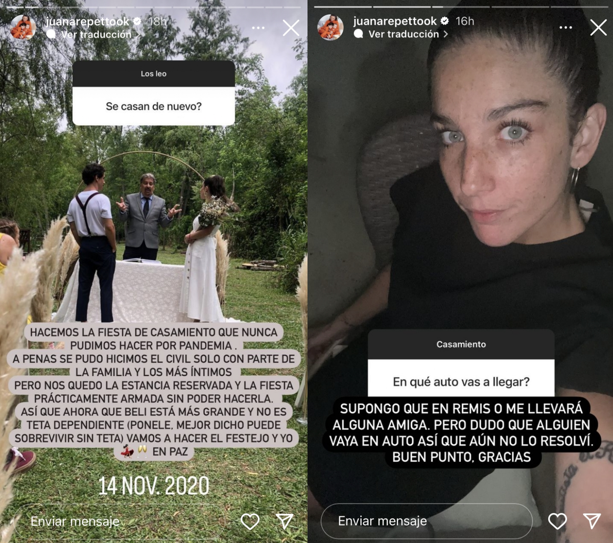 A través de las historias de Instagram, Juana Repetto se prendió con humor a contestar cuando uno de sus followers quiso saber cómo iba a llegar al encuentro: "Supongo que en remís o me llevará alguna amiga. Pero dudo que alguien vaya en auto así que aún no lo resolví, buen punto. Gracias”.