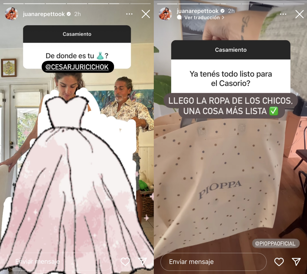 Y por último, una de las partes más importantes para la novia, que es la confección del vestido, confirmó que se lo está diseñando César Juricich. También ya tiene preparada la ropa de sus hijos en una tienda clásica de niños.