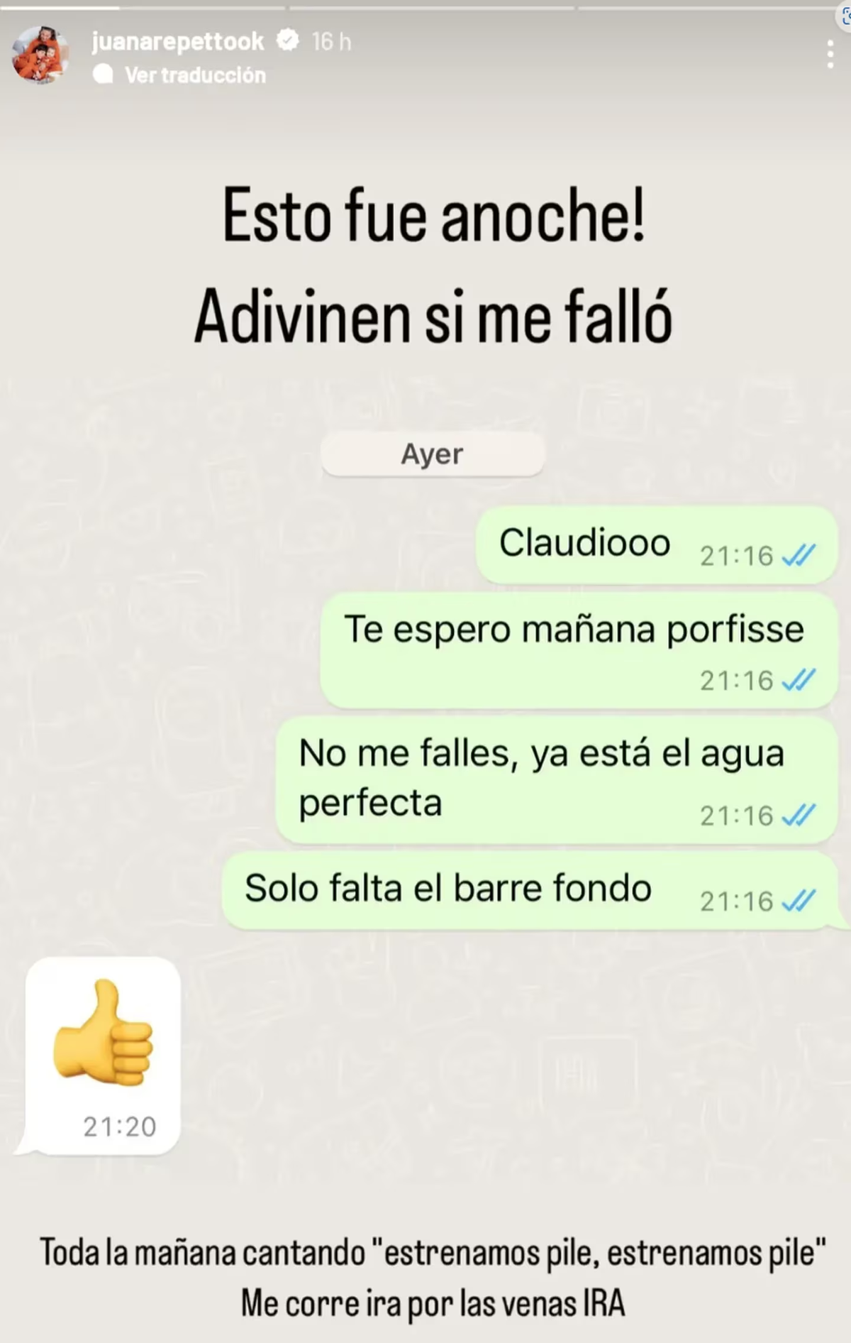 Finamente, la hija de Reina Reech reveló que Claudio nunca pasó por su casa y el arreglo en la pileta quedó inconcluso. "Toda la mañana cantando ‘estrenamos pile, estrenamos pile’. Me corre ira por las venas, IRA”, remató.