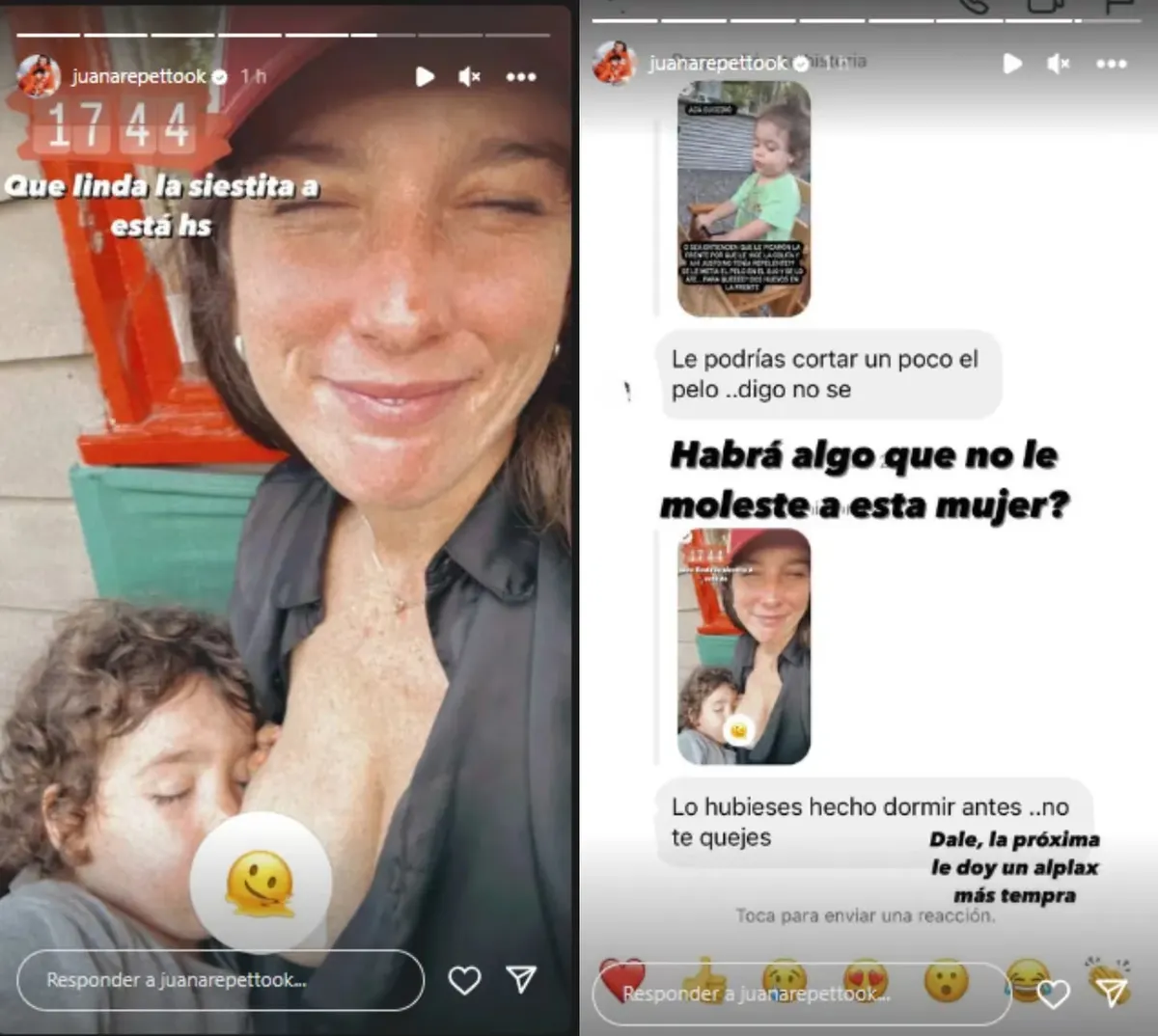 "Lo hubieses hecho dormir antes... no te quejes", le contestó esa mujer en una imagen donde la hija de Reina Reech estaba contando que no pudo dormir siesta porque tuvo que darle la teta a su pequeño, que finalmente se quedó dormido en su brazos. "Dale, la próxima le doy alplax más te temprano", retrucó Juana, indignada.